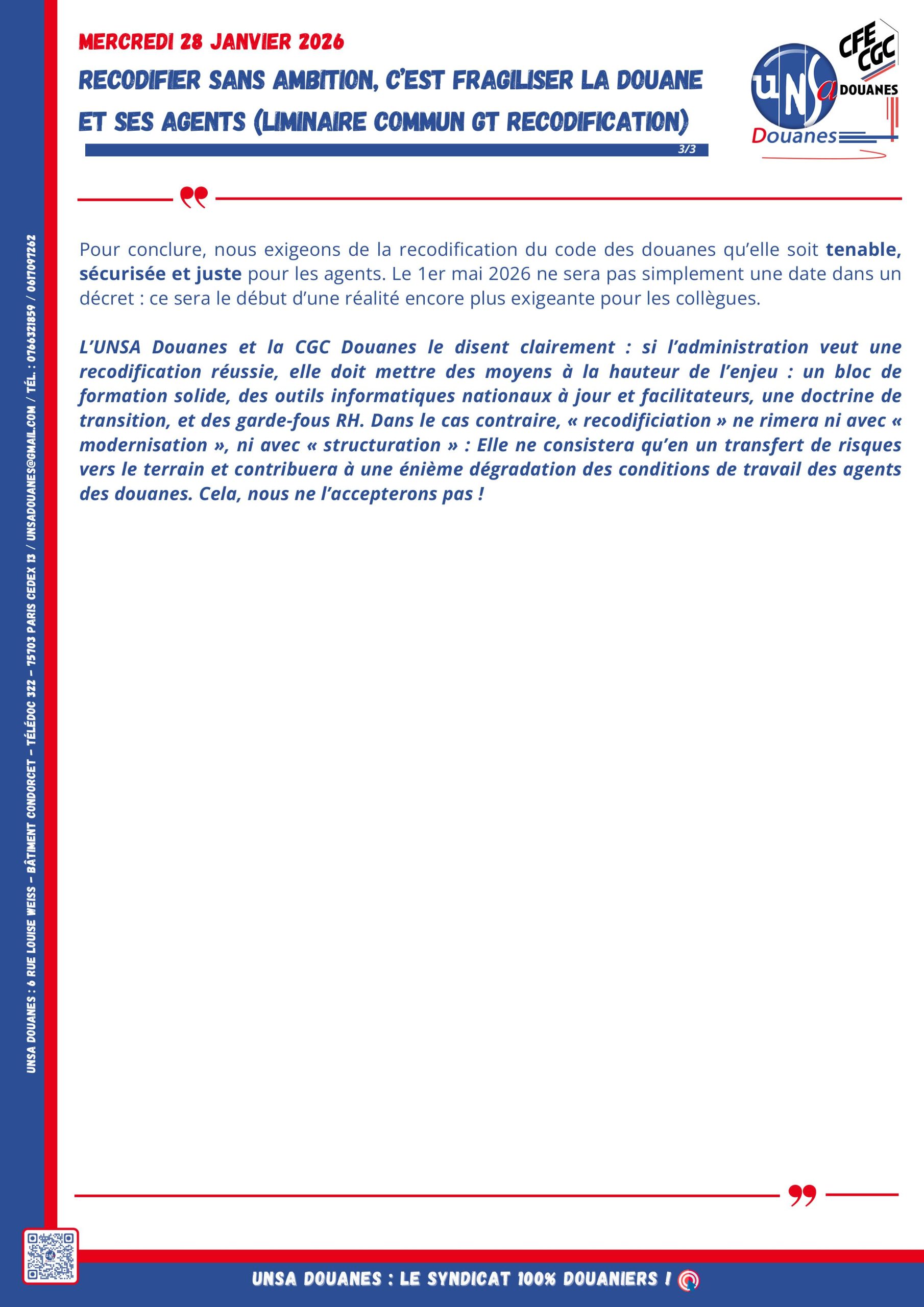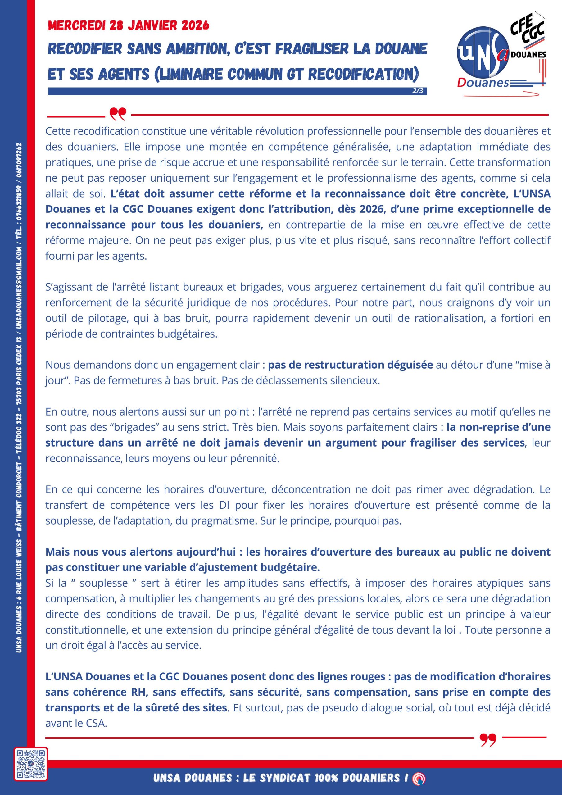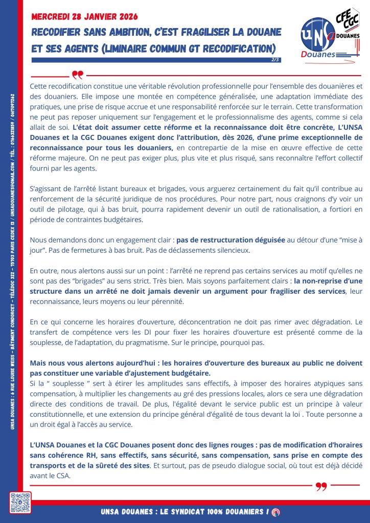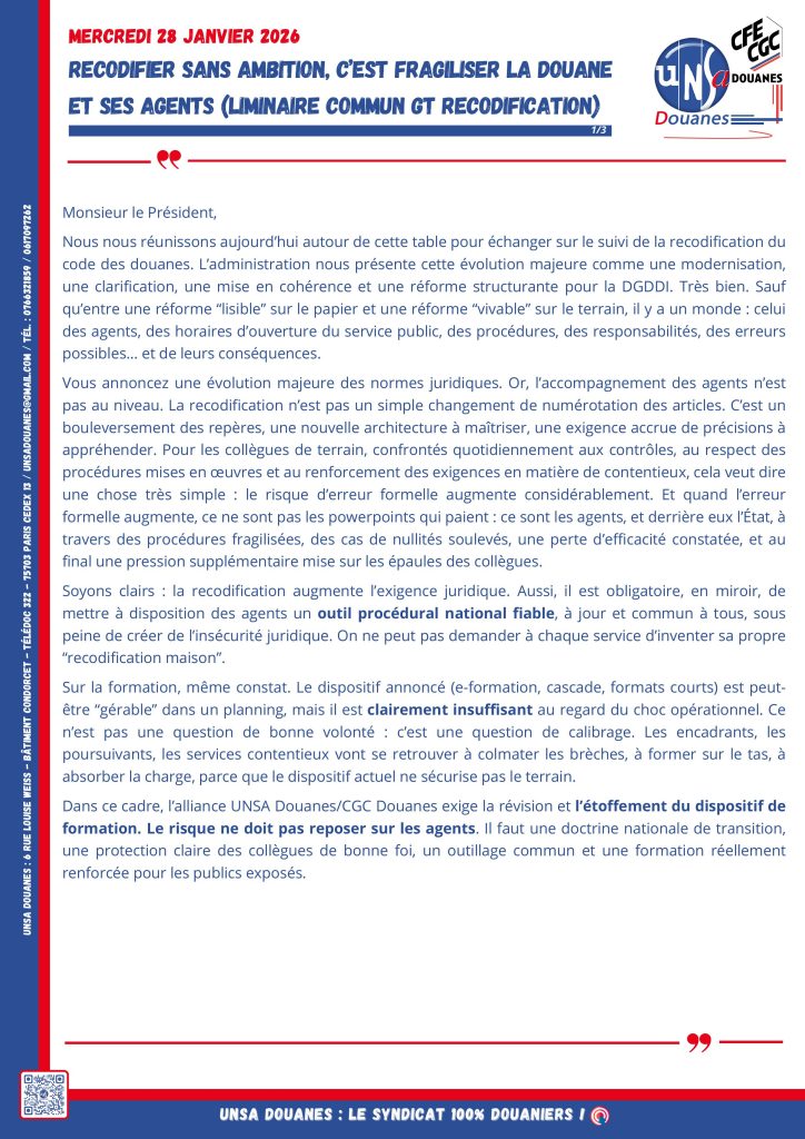 GT Suites de la recodification du Code des Douanes 28 janvier 2026 (déclaration liminaire commune) Posted on 28 janvier 2026 by admin