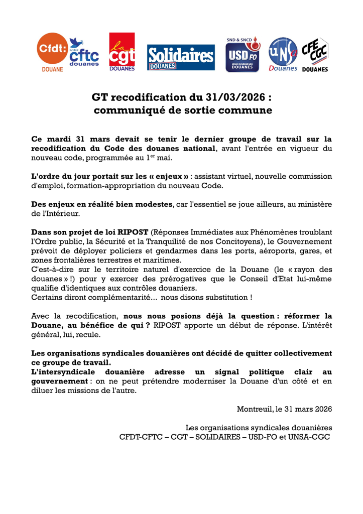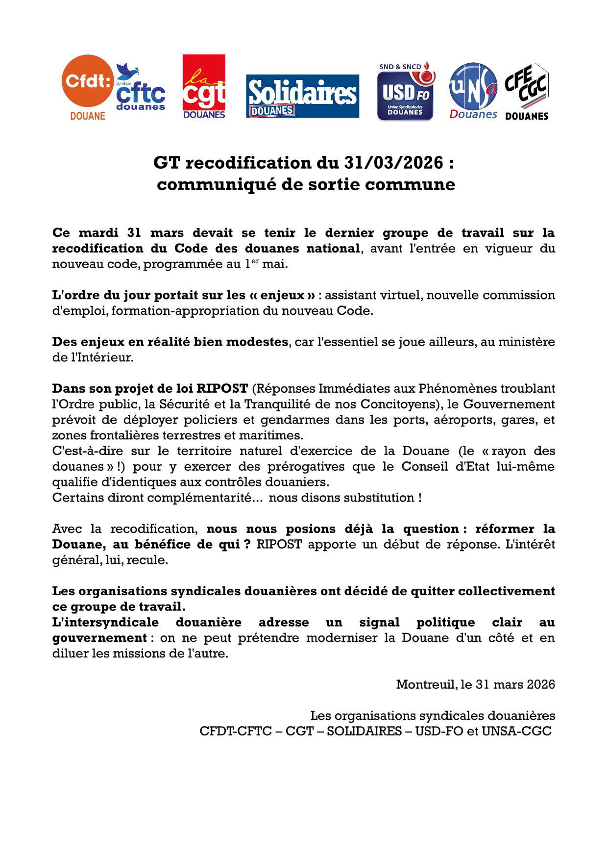 Intersyndicale : GT du CSA-R : Recodification du Code des Douanes